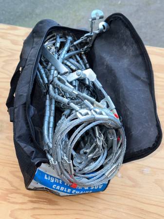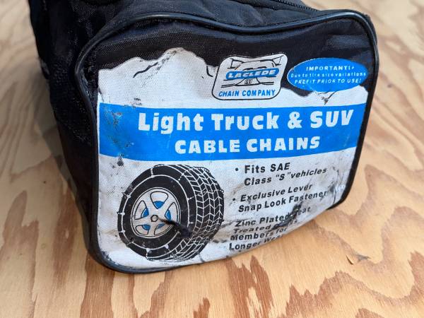 Brand-new unused pair of LACLEDE Cable Tire Chains 2021 are intended for use on radial/bias-ply tires. These come in original zippered Nylon storage bag. Cables have SAE Class (S) clearance, and are relatively easy to install, even under inclement weather conditions. Cable tighteners optional, not included. [Cable chains are sized to fit tire with enough slack to allow connection of metal links while tire remains on ground. Tighteners, when used, draw the cable chain taut to improve driving operation.] Cable chain set fits this range of tire sizes: