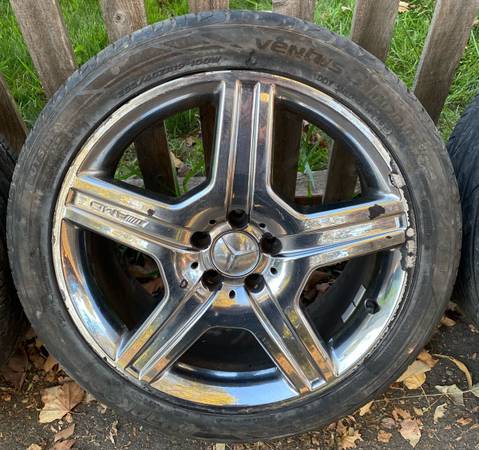 (4) Mercedes-Benz S Class AMG W221 19”. Staggered 255/40ZR19 275/40ZR19. One wheel is cracked and leaking air. The others hold air. Chrome wheels but have been curbed.