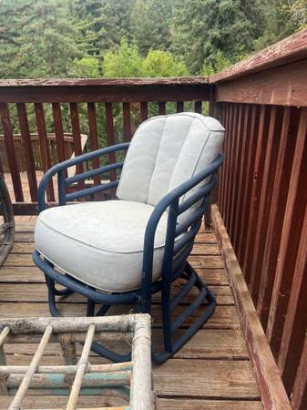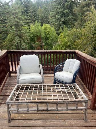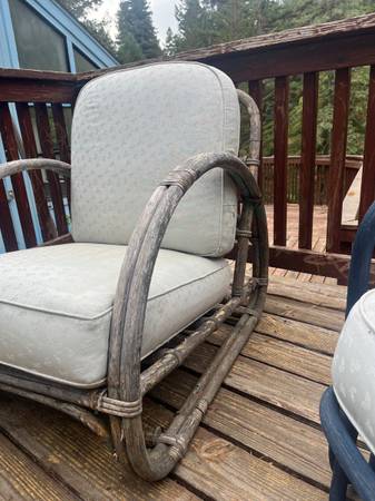 Needs to be re-done. I painted one chair and purchased the stuff to re-wrap the loose areas but don’t have time to complete it. The cushions are in decent shape. Could use a cleaning. Free to...