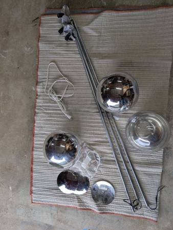 A gift we will never use that can now be yours, 3 mirrored plastic globes about 10" across, clear on the bottom, with 52" long rods and some hardware. Not sure of the brand but it was something fancy from a fancy person. Excellent last minute Christmas gift!