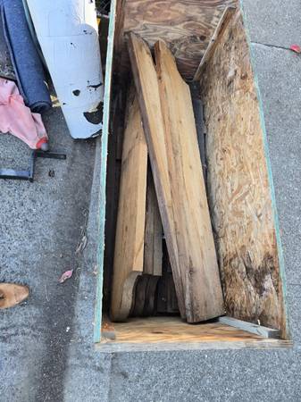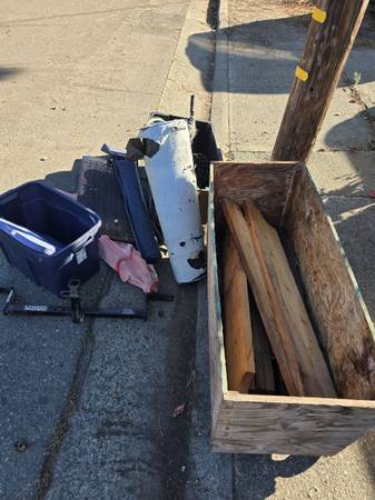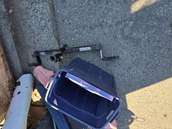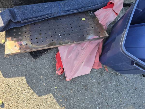 Umbrella, box of wood, rope, roofing material, scooter, planter rack, totes, carpet, stainless steel smoker drip tray, hitch, etc.