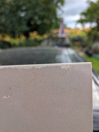 Two pieces beige composite countertop: 47" x 52" 3 sides with lips 38" x 26" One side w/lip flawed edges - changed plan to use in workspace delivery possible if not too far