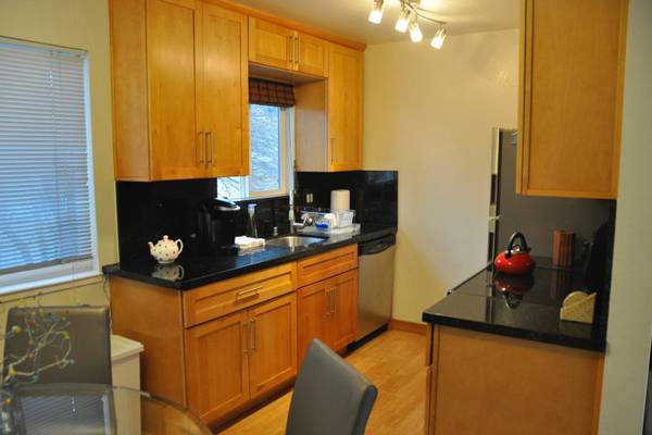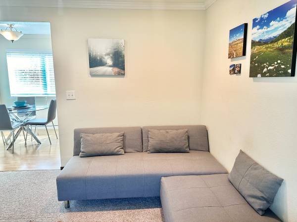 The apartment is modern looking with great lighting and nice kitchen appliances, new dishwasher, and a large bedroom comfortably fitting a king size bed. The apartment is in a gated quiet complex with respectful neighbors. The parking is a carport inside the building. Furniture include a King bed, sofa, 4-person dining table.