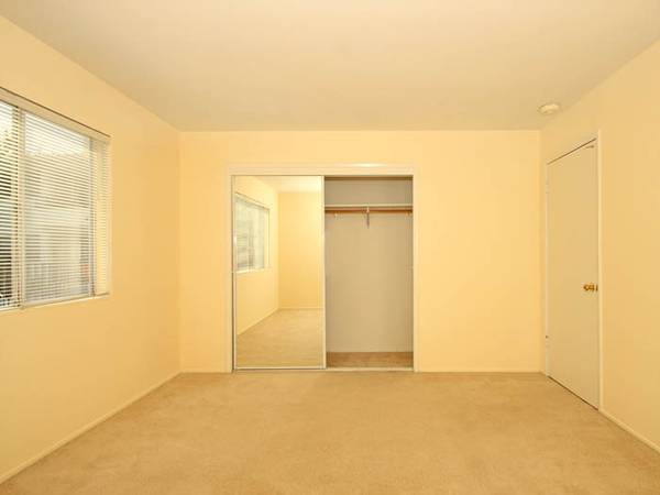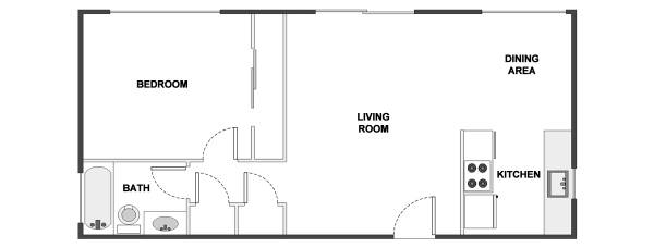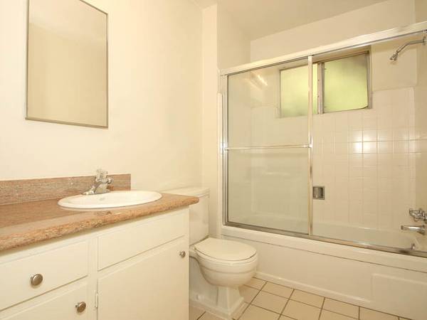 This one bedroom apartment boasts nearly 700 square feet. The galley kitchen has tile counters, a built-in electric stovetop, wall oven, full size refrigerator, and an adjacent dining area. The spacious bedroom features a large closet with mirrored closet doors and the bathroom has a tile floor, an upgraded sink vanity with storage, and a tub shower with a sliding glass enclosure.