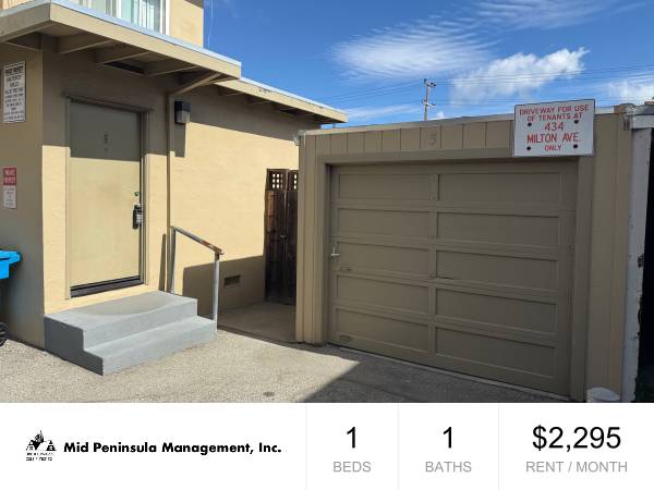 This one-bedroom unit with lots of natural light is perfectly located within blocks to downtown, shops, and restaurants. Coin operated wash and dryer available on the property in the Carports. Garage is included. Easy access to Cal Train. Bart and Hwy 101.. Nearby schools include Belle Air Elementary School, Allen (Decima M.) Elementary School and St. Robert. The closest grocery stores are Besan's International Market, Neelam Pacific Market and Mexicana Produce Market. Nearby coffee shops include Starbucks, Camino Corner Restaurant and Samovar Tea Lounge. Nearby restaurants include Kuya's Asian Cuisine, Thai Nakhorn and Mings Restaurant. 434 Milton Ave is near Posey Park, 7th Avenue Park and Grundy Park. No Pets Allowed