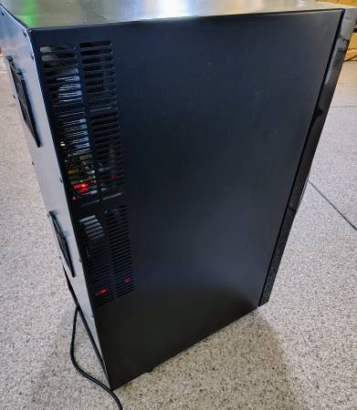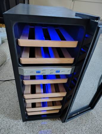 Digital controls with interior lighting; note: the right-side temperature display has a few missing segments. Controls work normally and both zones cool accurately—you can still set/adjust temps without issue.