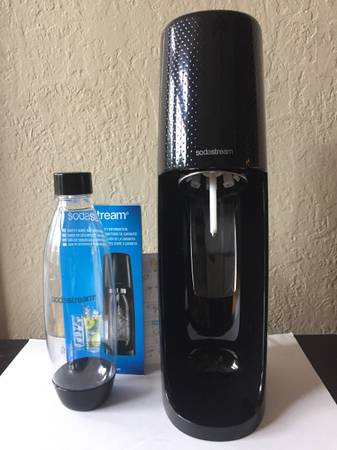 A brand new in box Black SodaStream Fizzi Soda Maker. Comes with the main unit,a new sealed, untouched full 60 liter CO2 cylinder, and the new 1 liter plastic carafethat is made for the Fizzi.