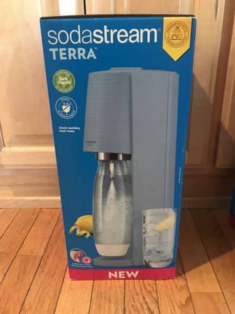A complete SodaStream Terra Soda Maker for sale brand new in the retail box. Itcomes with the main unit, a CO2 cylinder and the 1 liter plastic carafe that is madefor the Terra. This model is the newest from SodaStream, and comes with the new twist lock cylinder and carafe connection. It allows for a simple connection without having to screw on either the carafe or the CO2 cylinder.
