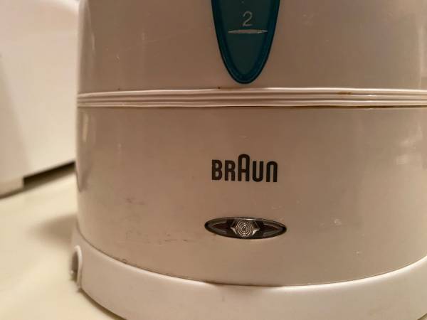 An eight cup, double insulated electric kettle in perfect working order boils water quickly and efficiently for coffee, tea, soups, etc. This Bruan kettle is German designed and made, is lightweight, automatically shuts itself off after 30 seconds of boiling and accidentally touching the induction plate will not shock or burn you. As an added safety precaution the flip-up top cap for filling must be firmly closed before the kettle will operate.
