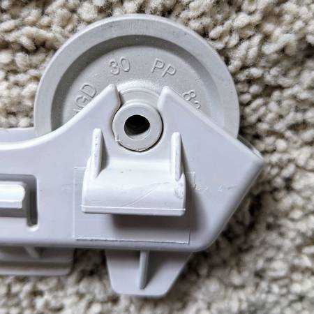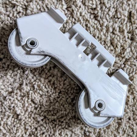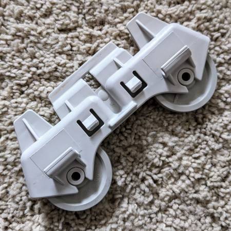 Selling four pre-owned Kenmore Whirlpool dish washer lower rack rolling double wheel assembly replacement parts - 4 available. In good cosmetic and working condition.