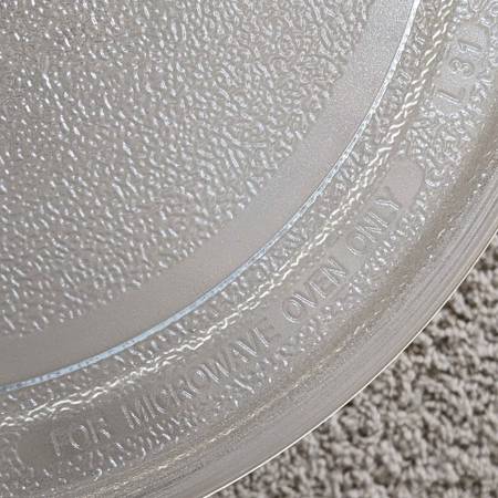 Pre-owned microwave oven replacement glass turn table platform platter for use in large household microwave models. It measures 12 and 7/8 inches in diameter and has special notches on the underside to fit into your microwave oven's centerpiece bushing for rotation.