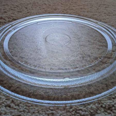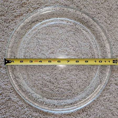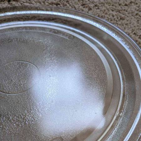 Pre-owned microwave oven replacement glass turn table disc platform for use in most medium size household microwave models. It measures 11 and 5/8 inches in diameter (plus or minus 1/8 of an inch). It has a flat underside with a smooth track that guides your microwave oven's rolling Y-shaped turnpiece for rotation. Good condition with small visible punctate defects on the top surface. No other damage, chips or cracks.