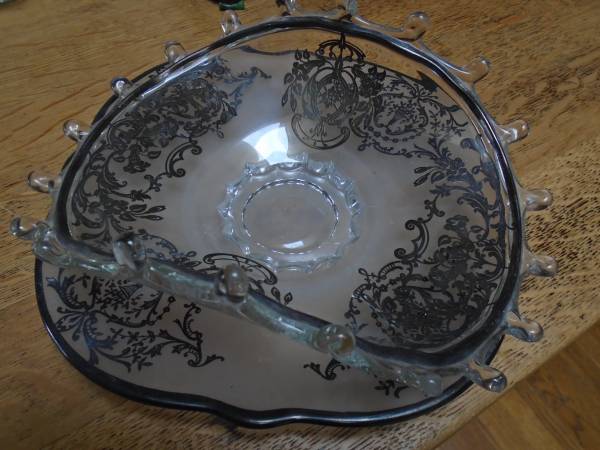 Such a Beauty .... Glass has Very Ornate Edges. Concaved .... Silver Overlay 8" x 6-1/2" across / This Dish is Wonderfully made: rises on sides ( highest point on 2 sides is 3-1/2")