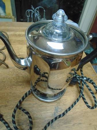 Great Style --- Excellent Condition/ Works Wonderful. Marked on Bottom E9437 / Pat Apr. 14 1914 marked: Fire King on Glass top on lid. 10-1/2" tall / 10" from handle to spout.