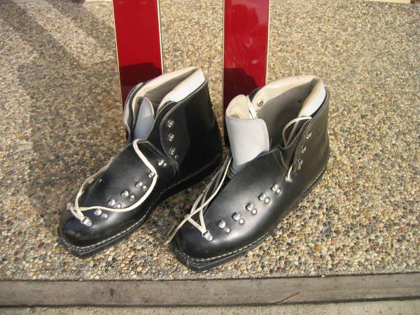 Quite a find... my father has Erbacher skis that he bought back in the 60s and NEVER used. These Erbacher SK 100's are bright red with not a single scratch thanks to great storage. The boots are made of black leather. They are a European size 44 which is equivalent to a size 11 here in the states. Poles are 50" ALLSOP Racers 7001.