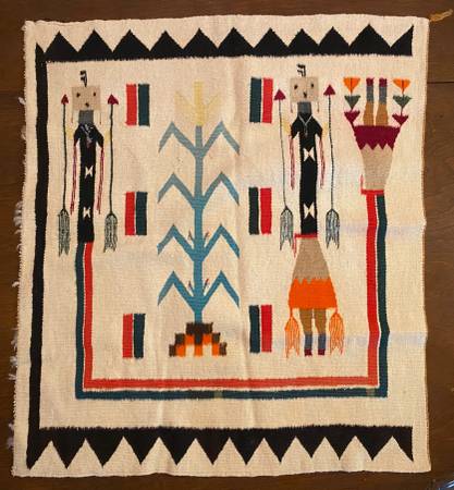 Asking %150 for largest Kachina, $100 for the middle-sized one and $100 for the small one with the structure behind it. Asking $375 for the rug. Ii's been appraised for $750. Will take $600 for the dolls and blanket together.