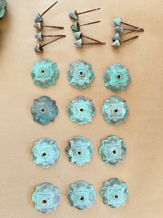 $99.00 for 12 Brass Clavos from Santa Fe, New Mexico. Green patina finish. Finish varies in each one. Adds a decorative element to doors and furniture.