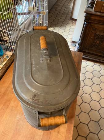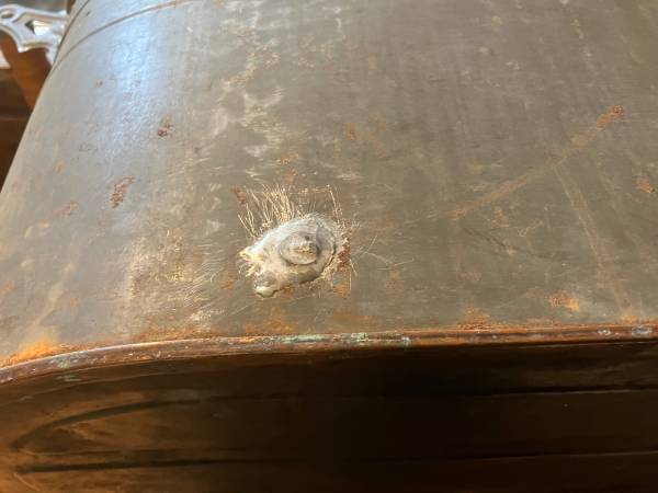 There are three solder repairs on the sides. There is a minor dent towards the bottom (see photo). The bottom is solid copper (magnet does not stick). The sides and cover are steel or tin. Condition as shown in 17 photos.