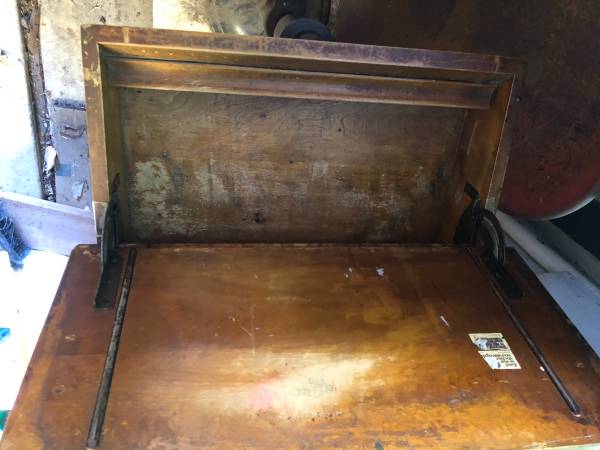A children's grammar school desk and chair chandler. Oak desk, oak seat and maple back on a cast iron base. The desktop opens up and has ink well. It is good condition for how old they are but will need work to bring back. It has been in storage for a long time and just never got around to restoring it. Measurements are in the pictures.