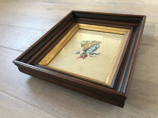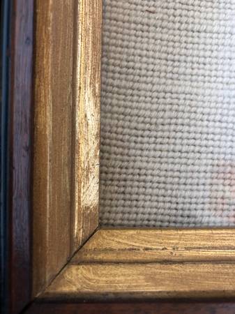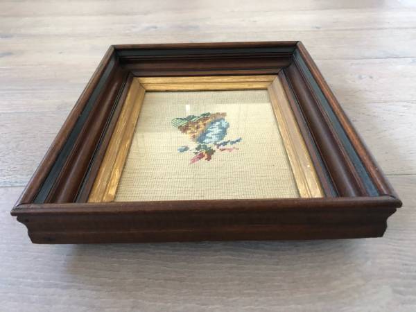 Antique Victorian 14” x 12” Gilded Walnut Shadow Box Frame w/ Needlepoint Flower. Not sure if the gild is hand painted. Looks like it has brush strokes. I didn’t open the back so there may be...