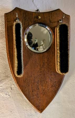 unusual Valet mirror, oak frame shaped like a shield, bevelled small mirror, comes with two brushes,--one for shoes and one for clothes striking look, excellent condition dimensions: height--16"...