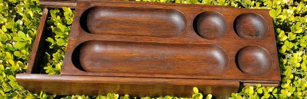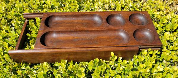 antique oak pen/pencil holder--original excellent finish--attaches inside desk drawer--indentations for pens/ pencils, coins, keys, and misc--sliding top reveals space underneath dimensions:...