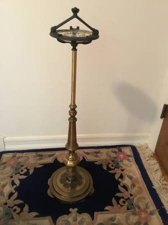 The stand is brass and is not the original. The cast iron ashtray is the original Parlor Putter. I have no idea what happened to the original stand. I remember my father having this in the 1960s. You can see pictures of the Parlor Putter online. I believe it was painted bronze. Complete ones go for $1000s. It weighs about 11 1/2 lbs.