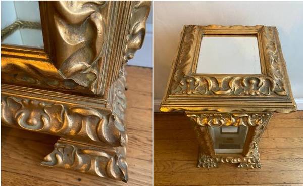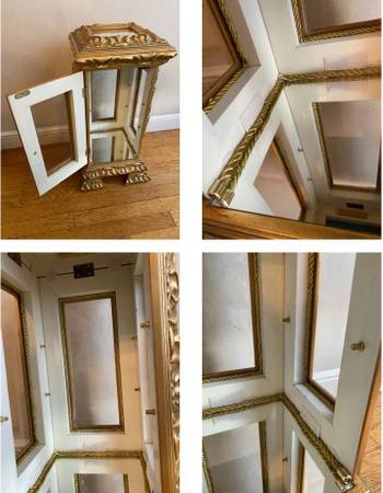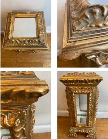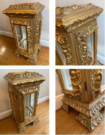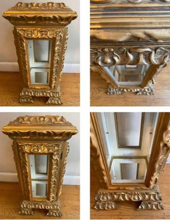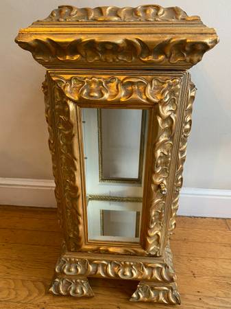 Measures 10 1/4" width by 10 1/4" depth and 21 3/4" high. A similar showcase is or was for sale on the chairish.com web site with it's two glass shelves for $995.00