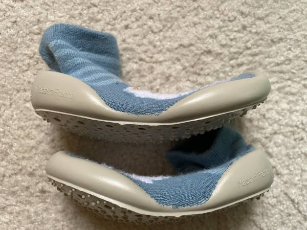 2. slippers, look like socks in the upper part, and like shoes in the lower part. The rugged bottom can prevent kid to fall, for 1 to 2 years old, made in France, the last 3 images, $20