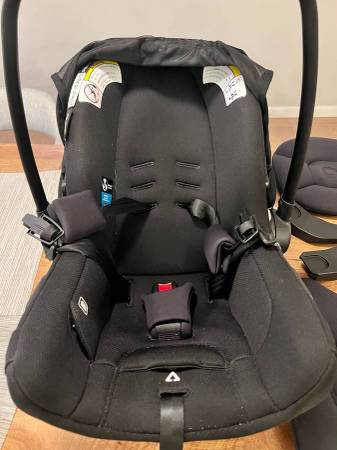 Bugaboo Turtle Air Shield by Nuna infant car seat with recline base in black. Travel-system ready – works seamlessly with Bugaboo strollers (adapters included). Features a five-point harness with magnetic buckle for quick buckling, a recline base with four positions and easy installation indicators, and adjustable head support with removable insert. Suitable for newborns 4–30 lb and up to 30 in. Lightweight at just 8.8 lb with a premium merino wool insert and memory-foam side impact protection. Excellent condition and comes from a smoke-free home.