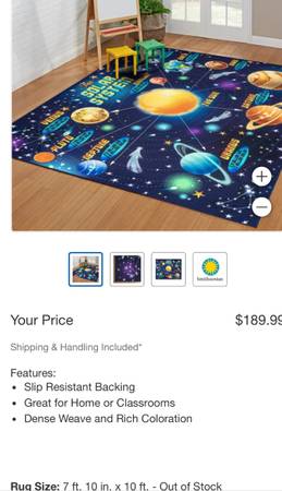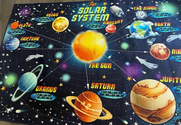 5.3x7.5” outer space area carpet by Smithsonian. Purchased new and hung on wall with 2 sided Velcro tape. This has NEVER been walked on that’s why it’s still in near new condition.