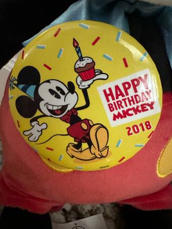 Disneyland 90th plush 18 inch Mickey Mouse happy birthday with 2018 button pin. Tagged. Pet and smoke free home. Asking $10 cash and pick up is in South San Francisco.