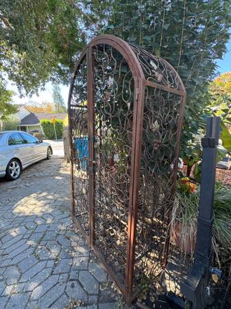 Heavy metal wine rack for an impressive display. Decorate design pattern. The unit holds 100 bottles and 16 wine glasses. Doors can be locked. Dimensions are: Height. 72” Width 36”