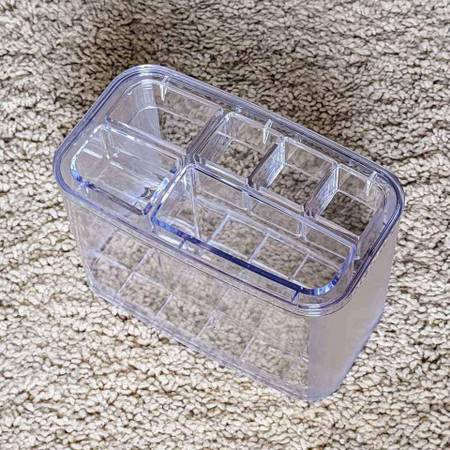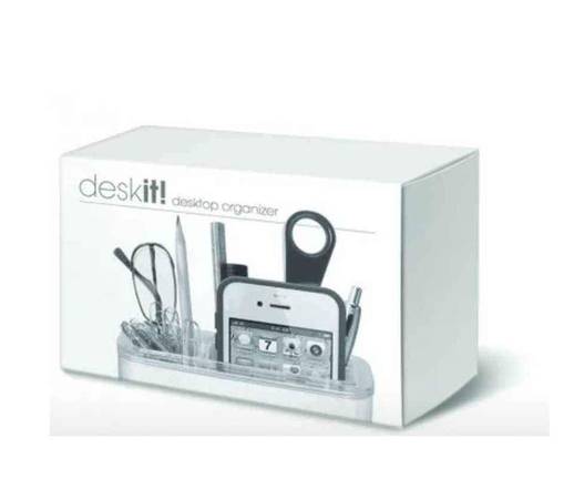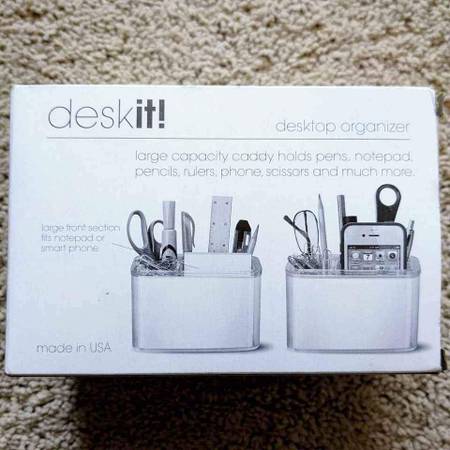 Brand new, never opened or used DESKIT clear plastic desktop knickknack supply organizer in original factory packaging. Large capacity caddy holds pens, pencils, notepad, rulers, scissors, phone, and much more. Large front section can fit a note pad or a smartphone. Organizador de escritorio de plástico.