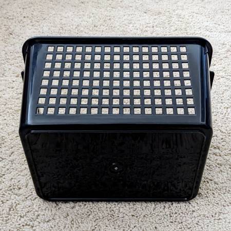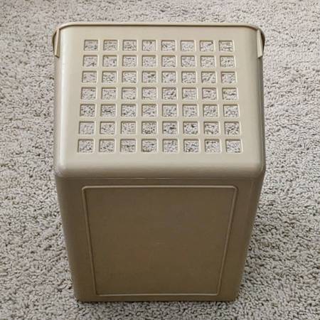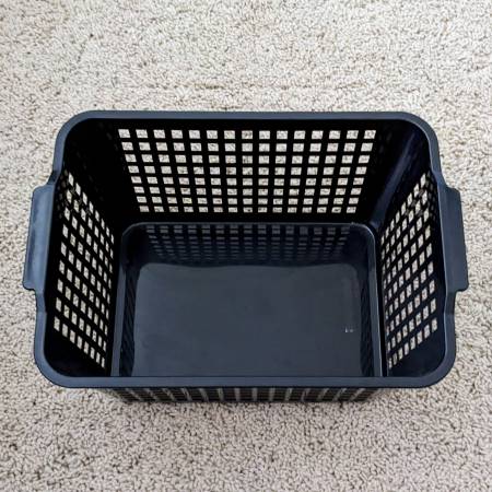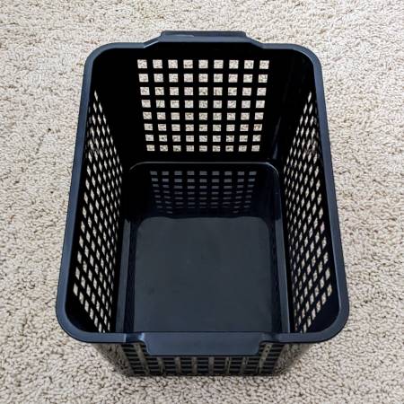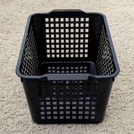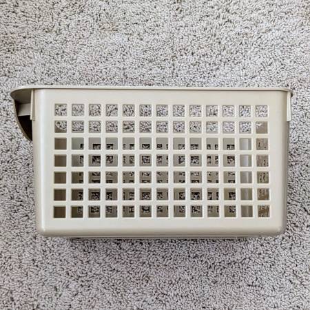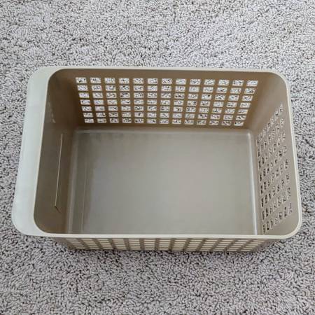 Here is a set of four pre-owned plastic baskets for organizing your bathroom, kitchen, bedroom, counter, pantry, etc. Three or the same kind and one that is a bit smaller. The beige or tan ones have a solid front with labels for writing. The smaller black one has mesh sides all around.
