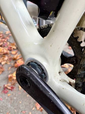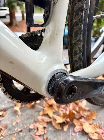 The frame previously had cracks near the bottom bracket, which were professionally repaired by Spider Composites in Scotts Valley. It has been ridden post-repair with zero issues. Photos of the repaired area are included. After the repair, a new bottom bracket and crankset were installed.