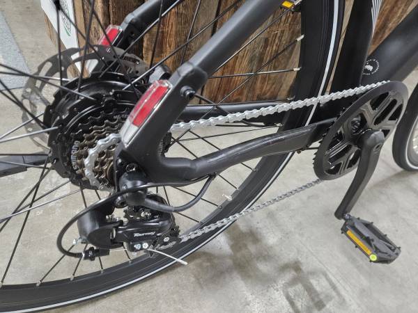 Electric bike with hydraulic disc brake, simple 1 by drivetrain, removable battery, 45lbs, class 2 with throttle and pedal assist, range is 20-30 miles and 40-50 miles respectively, perfect commute bike with 350w powerful hub motor and 38mm tire for versatility. It is a popular choice in this price range and Aventon is local in California.
