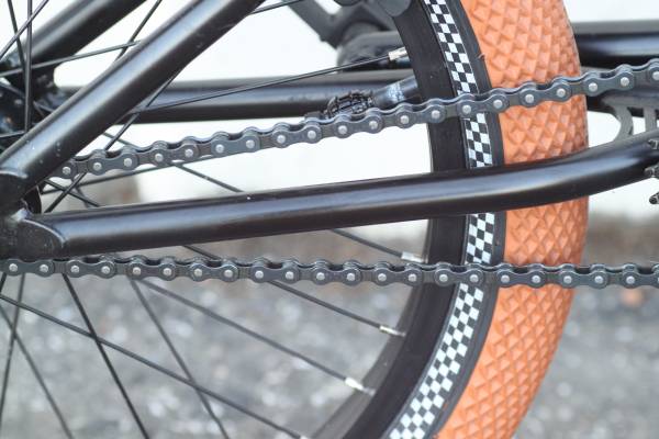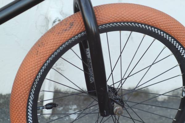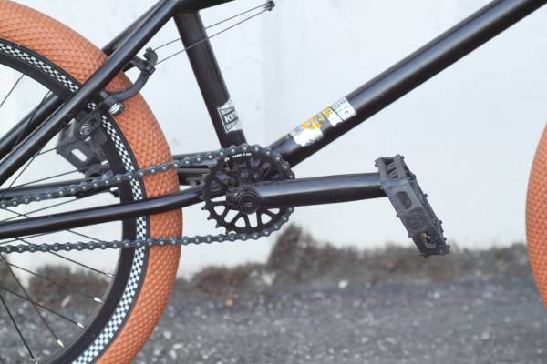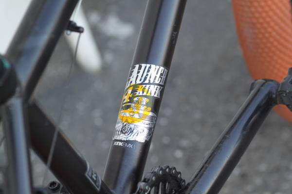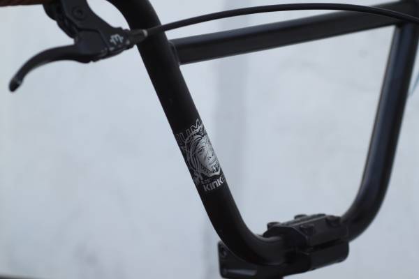 This bike has Mission Rank 25T front chainring, Kink Bold HRD stem, Kink 8.75” bars, Mission brake lever, Mission Triumph cranks, Kink platform pedals and Vans Waffle Cut tires.
