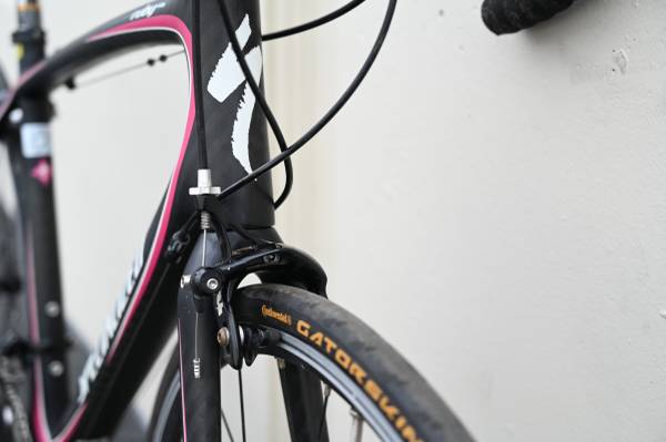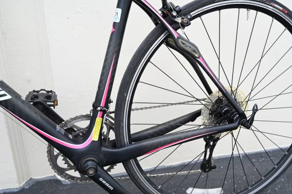This Specialized Ruby Elite women’s road bike features a lightweight FACT carbon frame with a FACT carbon fork and a SRAM 2x10 drivetrain. This bike is in really nice shape and wants to go fast, but is also comfortable on rough roads. The Zertz inserts in the seatstays and fork legs provide a compliant, yet efficient ride. This bike provides plenty of performance and can even be a great beginner race bike. Or just go climb some mountains and put on the miles and smiles.