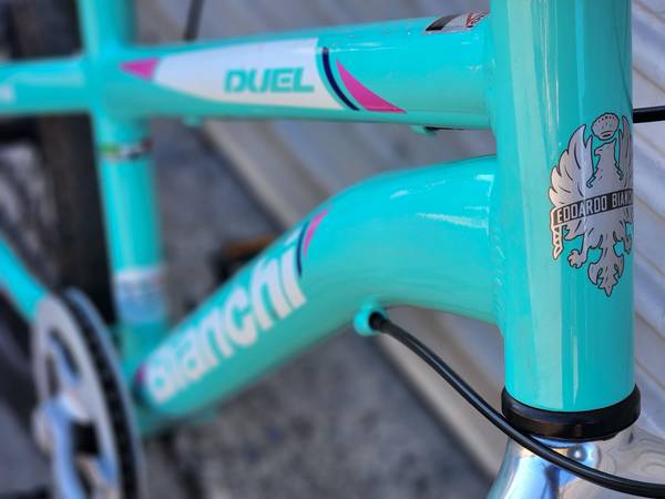 Classic Bianchi Duel youth mountain bike in the brand’s iconic celeste color. Bianchi, founded in Milan in 1885, is the world’s oldest bicycle manufacturer and a symbol of Italian cycling heritage. Their signature celeste green is instantly recognizable and beloved by riders worldwide.