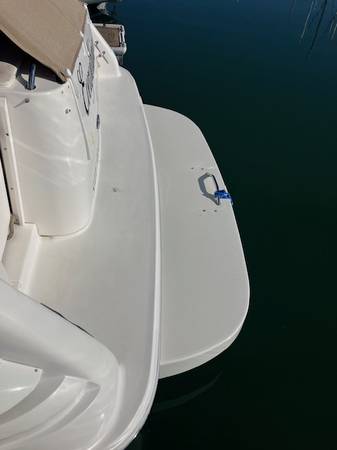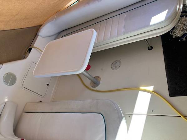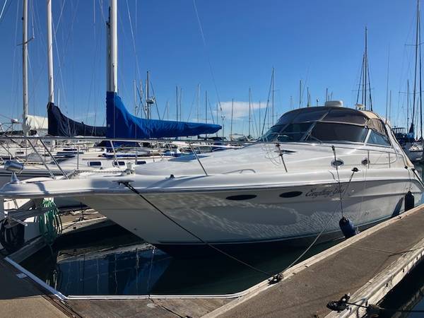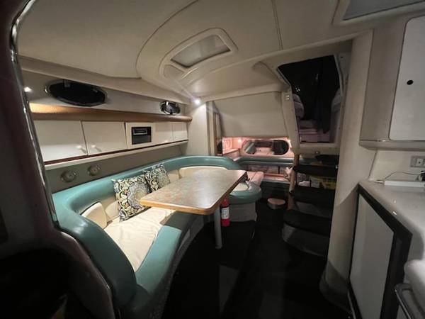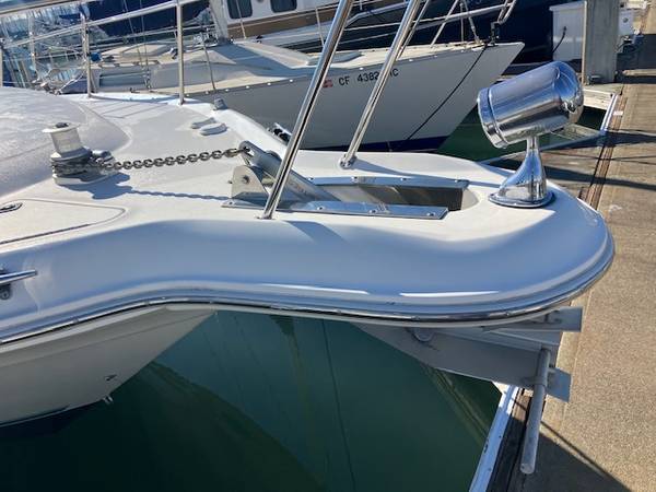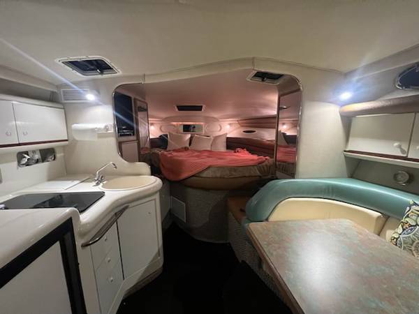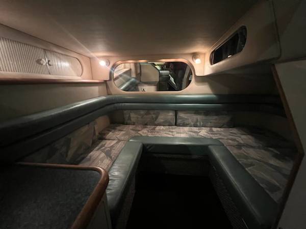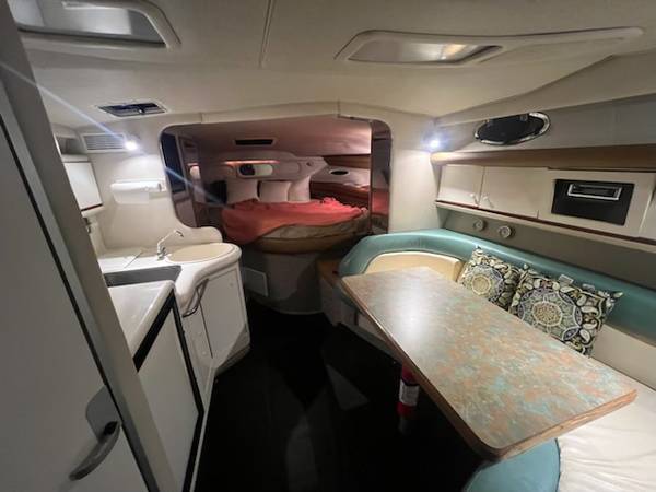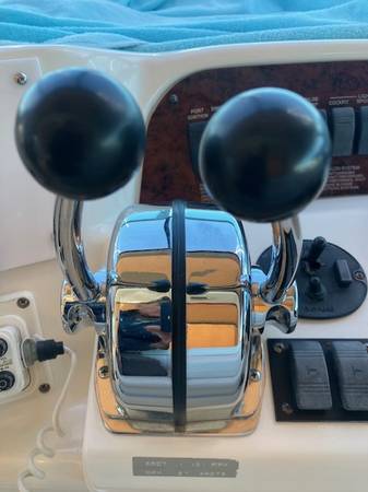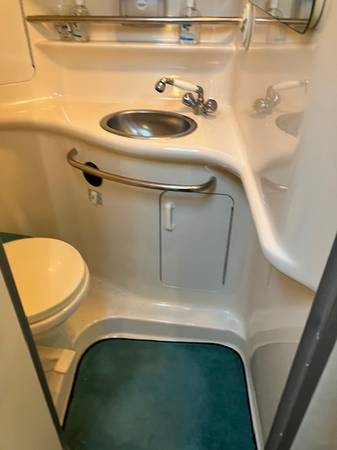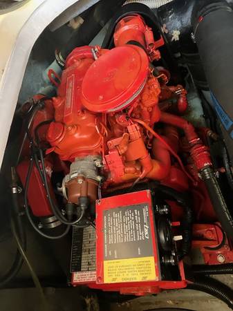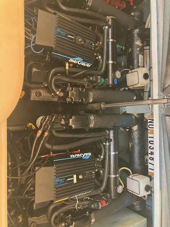 She has twin 330 hp. MerCruiser with V-Drives, NEW isinglass and Canvas, engine records, exterior detailed and polished, Vac-U-Flush fresh water head with shower, single handed engine controls, and lighted engine systems monitor gauge at the helm.
