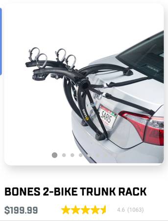 Saris Bones bike rack for 2 bikes. Fits a variety of cars. Practically new -used just a few times (I bought an SUV). I can help you adjust it to your car. Retails for $200.