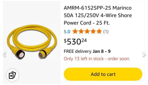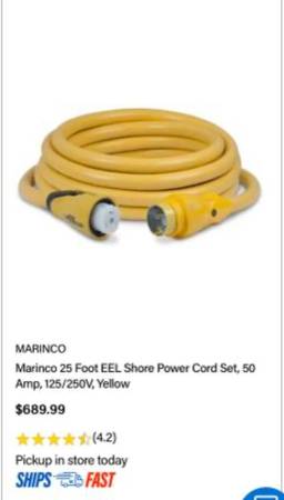 Bought and never used. Been in storage unused. 25' 50/125/250 volt Marinco power cord . I can deliver from Half Moon Bay to Antioch. Sells on Amazon for $530.24 and West Marine for $689.99 plus tax....