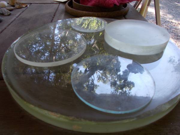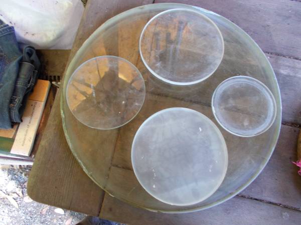 Port Hole: 'Real', 16inch, Clean, 1-inch Thick! ...w/4-Glass Circles, Different: Size/Thick/Round! ...*Also: 2-Round 'Wheels'? ...Flat/Curved! ...*Details/Photos: Steve /