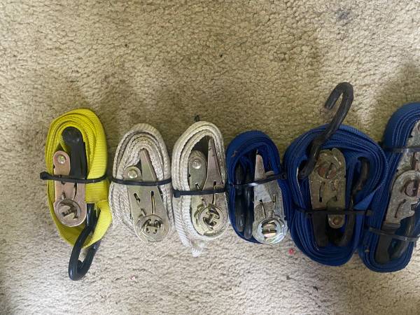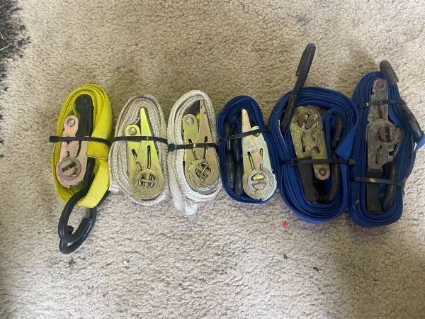 6 RATCHETING TIE DOWN STRAPS LIKE NEW ALL IN GOOD WORKING CONDITION MUST SEE WILL SELL SEPARATELY OR ALL TOGETHER SEE THE PICTURES CONTACT TOM AT