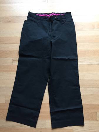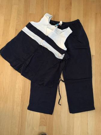 Motherhood: dark blue capris with blue/white sleeveless top, size M (fits US 6/8), linen - $13