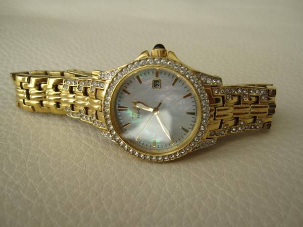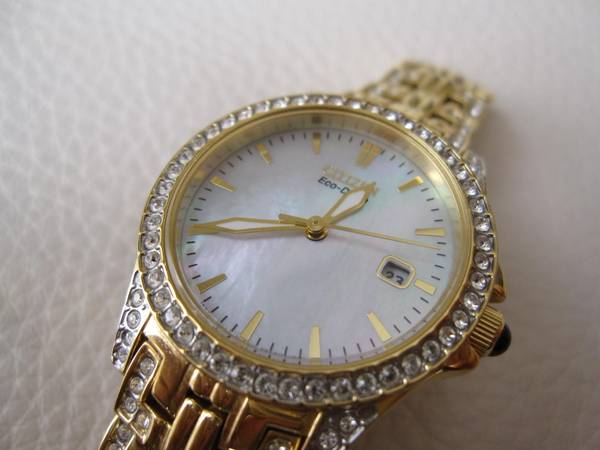 Classic lines with a hint of sparkle are hallmarks this Citizen Silhouette watch that shine bright with Swarovski crystals. Featured with gold-tone stainless steel case and bracelet with a Mother-of-Pearl dial enhances the elegance. The watch is pre-owned but still in excellent condition showing no wear. Links can be removed to ensure correct fit.