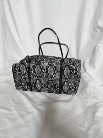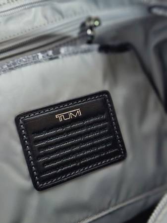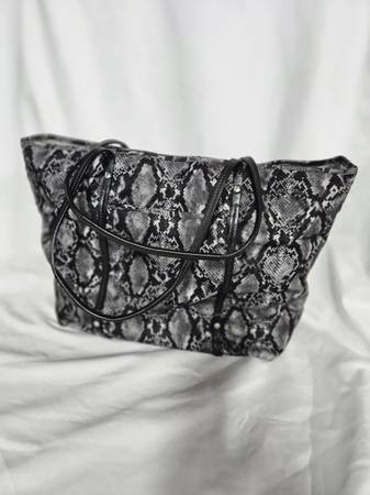 The Tumi Women's Large Snakeskin Design Nylon Tote Bag features a black leather handle/strap and a gray lining. It is part of the designer Tumi product line, perfect for women looking for a stylish and functional tote with a snakeskin print exterior. Made of durable nylon material, this tote is both fashionable and practical for everyday use.