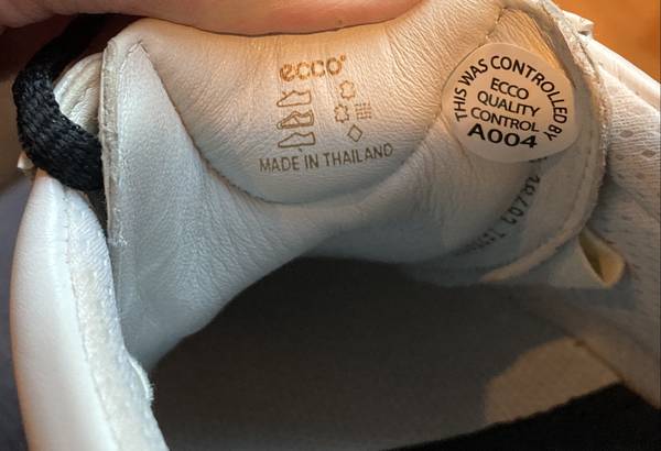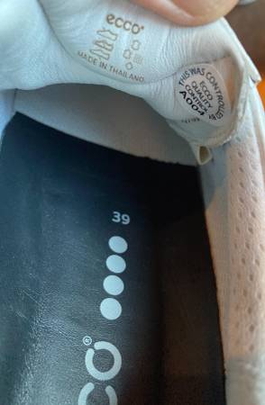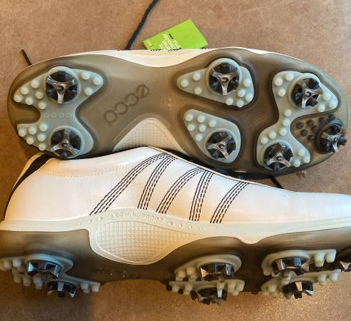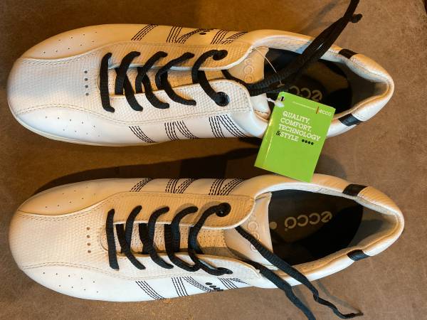 Reduced for quick sale! Beautiful BRAND-NEW, NEVER-WORN pair of ECCO women's golf shoes US8-8.5, EU 39, New-in-Box with tags. A Christmas present for my daughter in 2021, she never wore them -- MSRP was $130 new. Downsizing - it's time to sell everything that isn't nailed down. These will make you a star when you give to your wife, daughter, or grandma -- or yourself! A super nice Anniversary, Birthday or Memorial Day present! Ecco makes very high-quality shoes - original price of $130! Great Deal from a great maker of fine footwear!