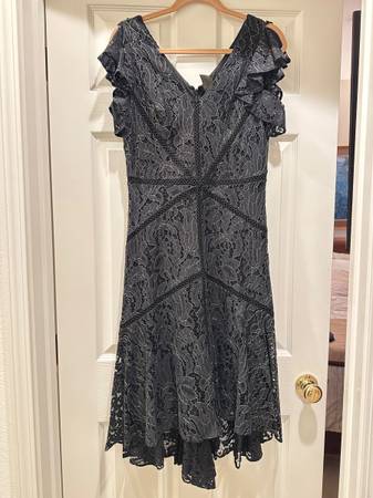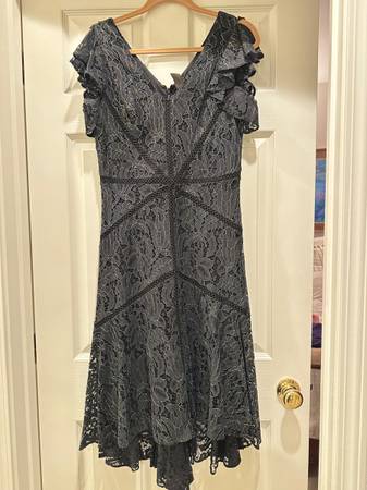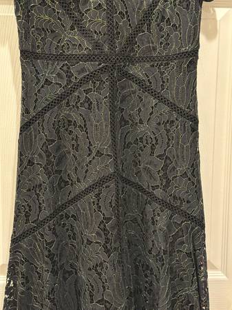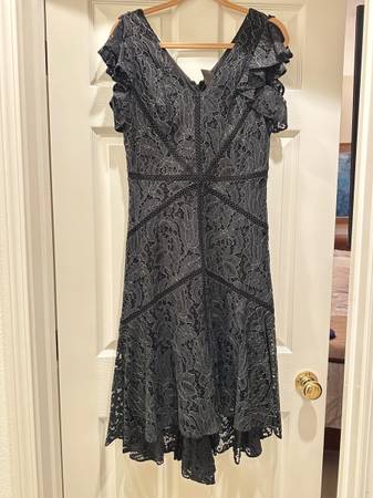 Elegant black and gold thread lace dress High Low hem. Taylor Brand Originally $140 Size 8 but will fit Size 6 as well